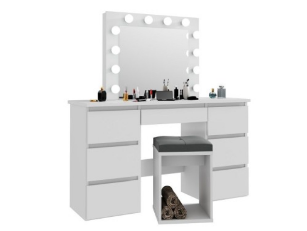 Nowoczesna toaletka kosmetyczna w stylu Hollywood z dużym lustrem i efektownym oświetleniem to idealny wybór dla kobiet ceniących komfort, elegancję i perfekcyjną organizację kosmetyków.