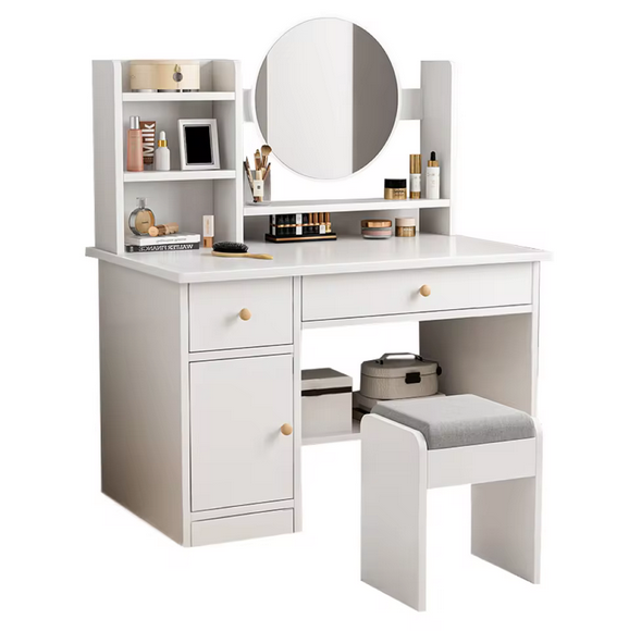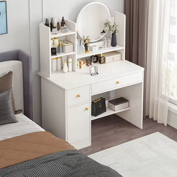 Elegancka Toaletka z Okrągłym Lustrem i Pojemnymi Schowkami – Perfekcyjny Kącik Beauty w Twoim Domu