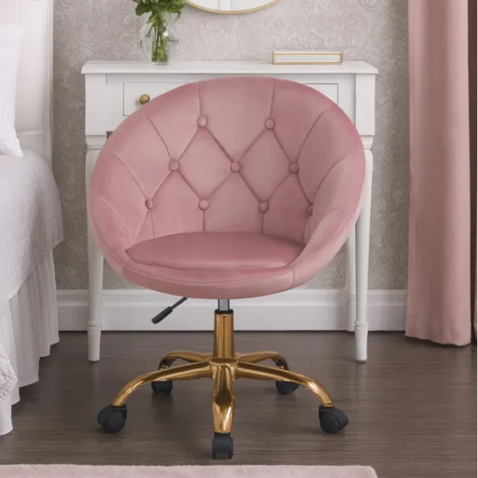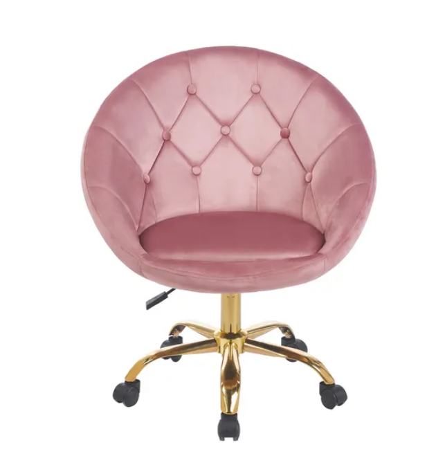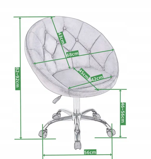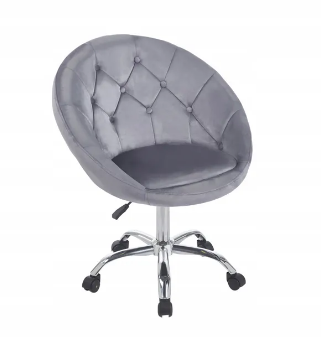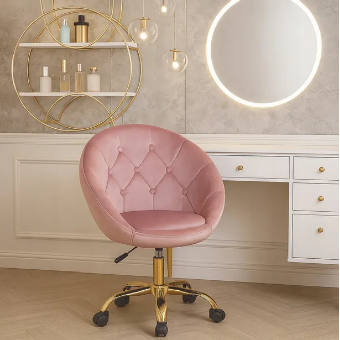 Dodaj swojej przestrzeni odrobinę luksusu dzięki temu wyjątkowemu fotelowi, który łączy kobiecy styl, miękki welur i nowoczesną funkcjonalność. Jego okrągła forma, pikowane oparcie oraz złota podstawa sprawiają, że to idealny mebel do toaletki, domowego biura czy eleganckiej sypialni.