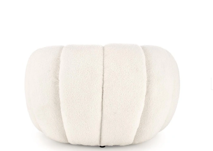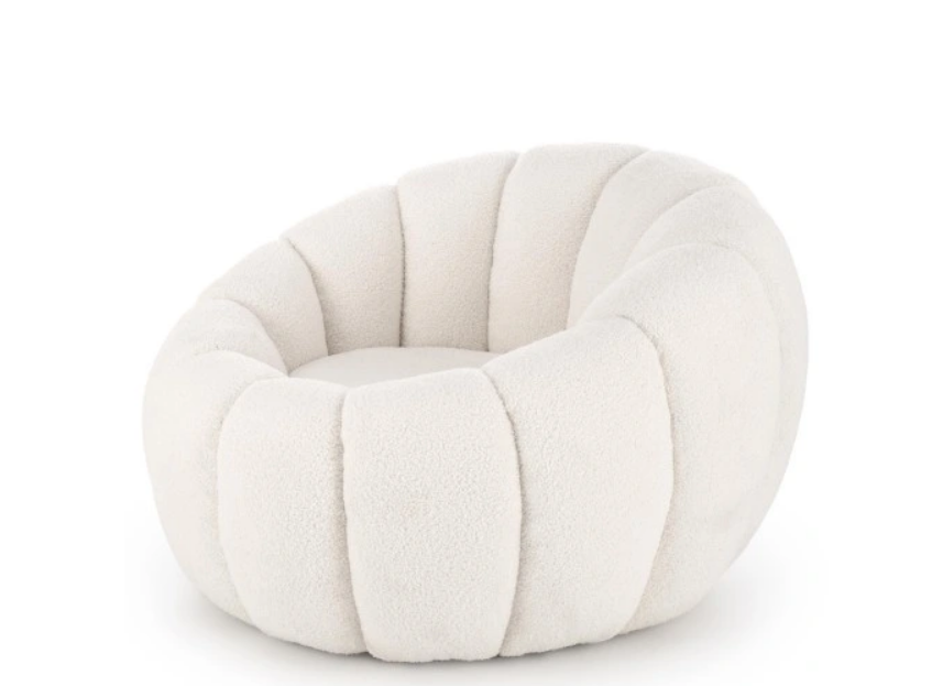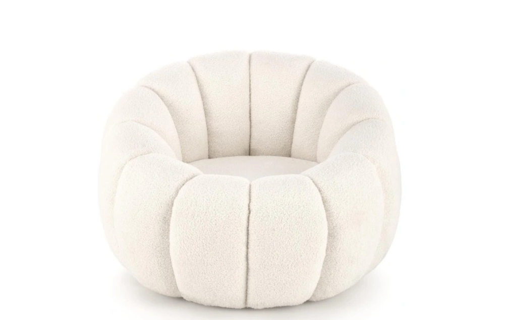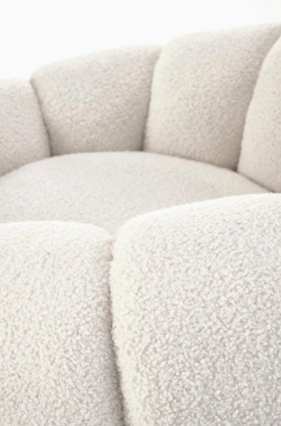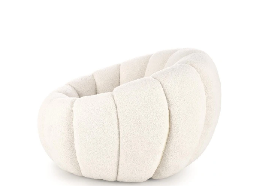 Ten fotel to połączenie nowoczesnej formy z niepowtarzalną przytulnością. Obłe, harmonijne kształty oraz pikowana konstrukcja tworzą efekt „pączka”, który wręcz otula sylwetkę, zapewniając maksymalny komfort. Wysokogatunkowa tkanina Bouclé w eleganckim odcieniu kremu dodaje wnętrzu klasy, lekkości i wyjątkowego charakteru – dokładnie tego, co przyciąga uwagę w modnych aranżacjach glamour i modern cozy.