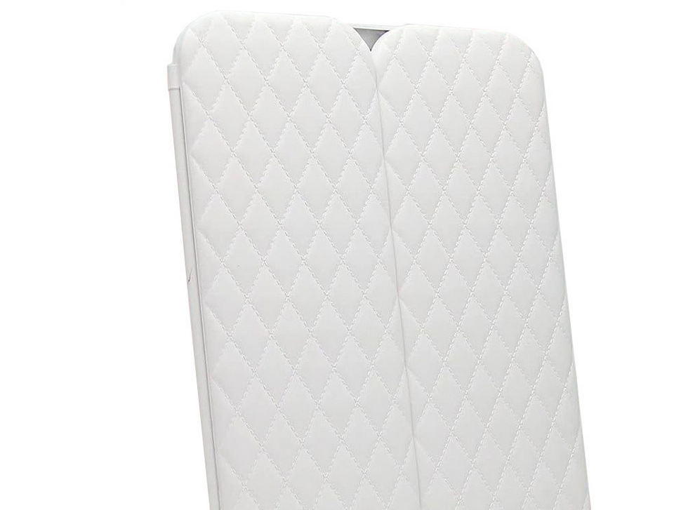 Białe, pikowane drzwiczki nadają lusterku elegancki, nowoczesny charakter. Idealnie dopełnia toaletkę, a jego design przyciąga wzrok i podkreśla styl wnętrza.