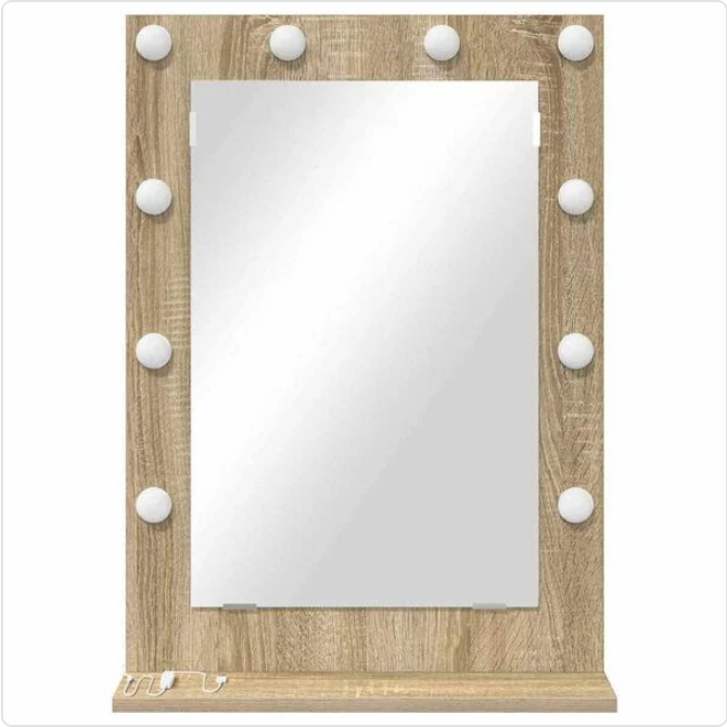Rama w odcieniu postarzanego drewna pięknie komponuje się z toaletkami w stylu naturalnym, rustykalnym, boho czy loftowym. Oświetlenie LED rozmieszczone wokół lustra gwarantuje jasne i równomierne światło, które podkreśli każdy detal Twojego makijażu, a jednocześnie stworzy elegancki klimat niczym w garderobie gwiazdy.