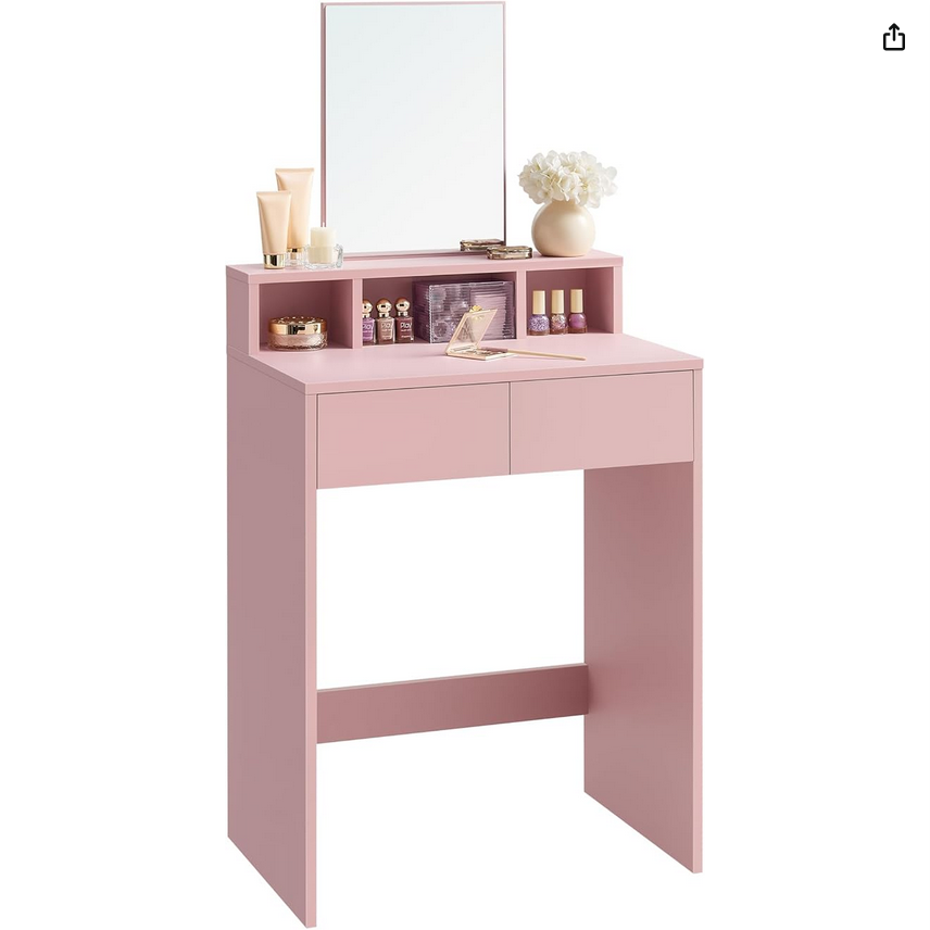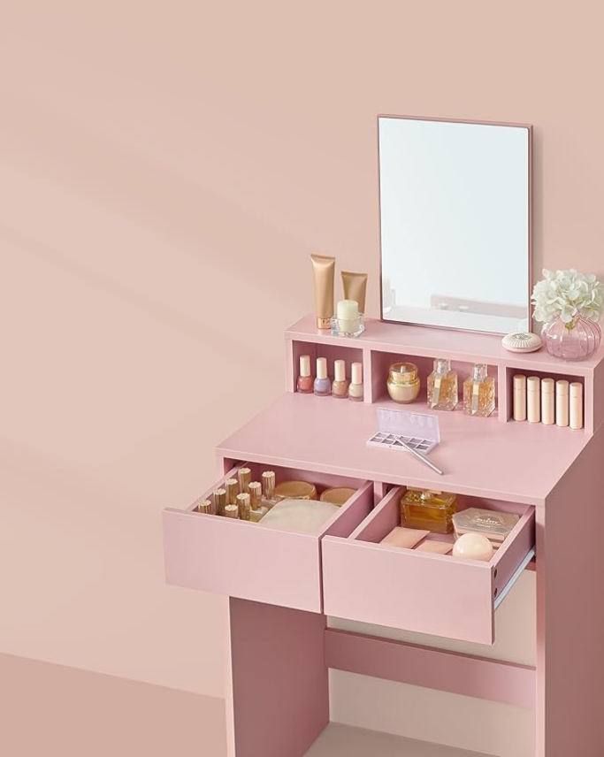 VASAGLE Nowoczesna Toaletka w Odcieniu Pudrowego Różu z Lustrem i 2 Szufladami – Idealna do Makijażu i Organizacji Kosmetyków