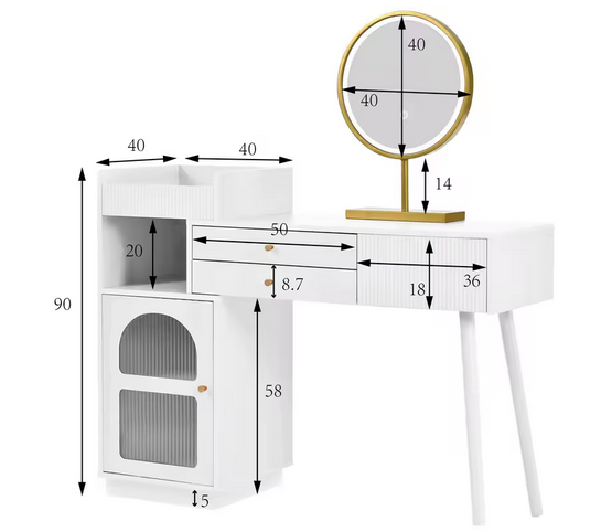 Dzięki bocznym segmentom z dodatkowymi półkami możesz ustawić toaletkę tak, jak najbardziej lubisz — prosto lub pod lekkim kątem, zwiększając wygodę i przestrzeń na kosmetyki.