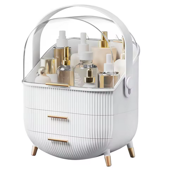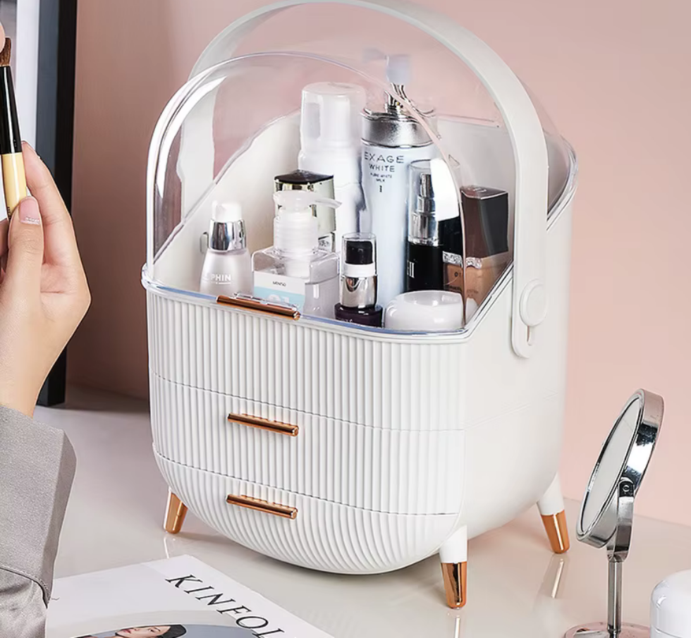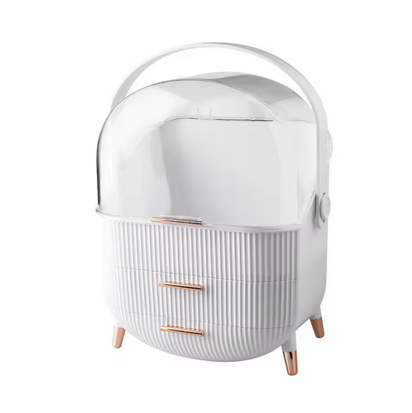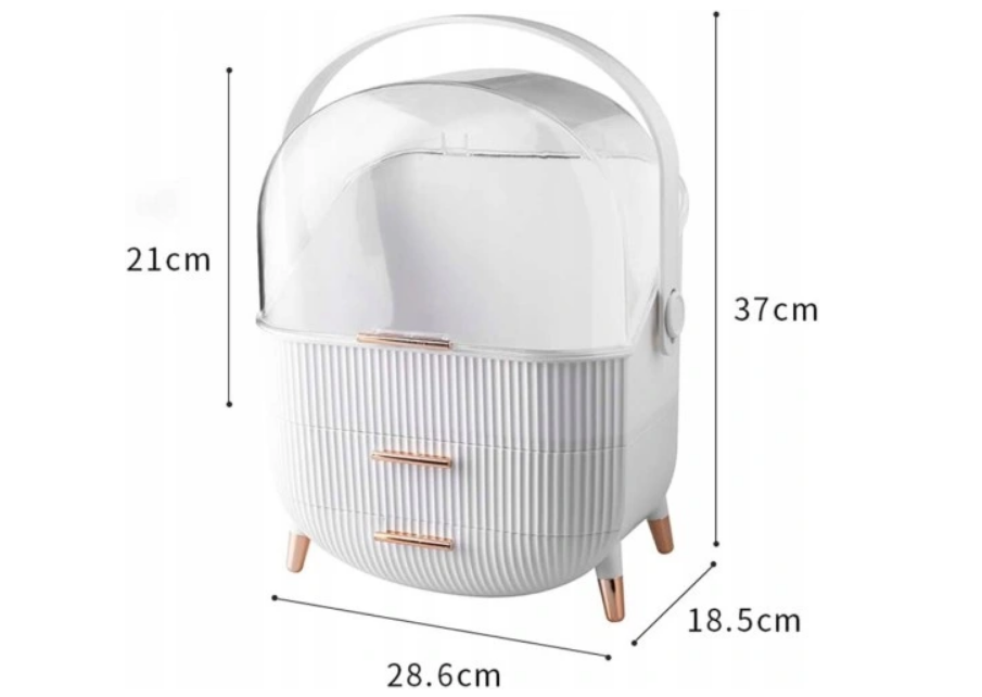 Poznaj organizer, który odmieni Twoją codzienną pielęgnację. Elegancki, funkcjonalny i zaprojektowany tak, aby każdy kosmetyk znalazł swoje miejsce. Dzięki przezroczystej kopule i potrójnym szufladom zyskujesz nie tylko piękny element wystroju, ale przede wszystkim wygodny system przechowywania, który oszczędza czas, miejsce i… nerwy.