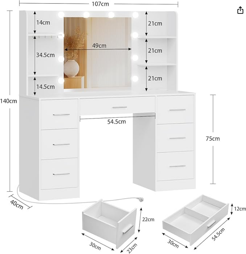 TEENFON Toaletka ze światłami, toaletka z lustrem i gniazdkiem, toaletka z 7 szufladami, 6 półkami i 5 haczykami, nowoczesna, biała