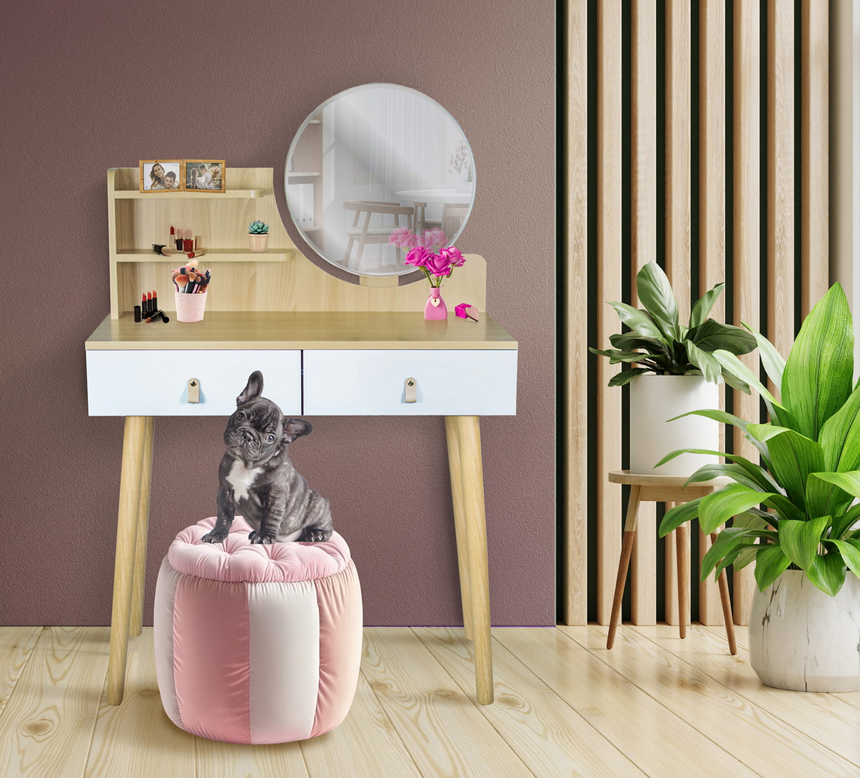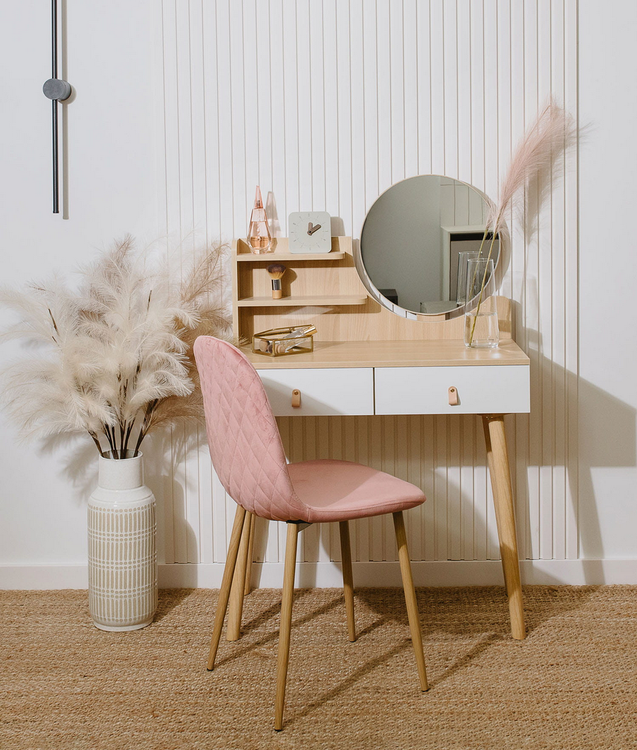 Wybierz toaletkę, która łączy minimalistyczny design z funkcjonalnością, tworząc idealne miejsce do codziennej pielęgnacji i makijażu. Ten model to harmonijne połączenie bieli, naturalnego drewna i delikatnych, zaokrąglonych form — dzięki temu wprowadza do wnętrza lekkość, świeżość i estetykę rodem z nowoczesnych aranżacji.