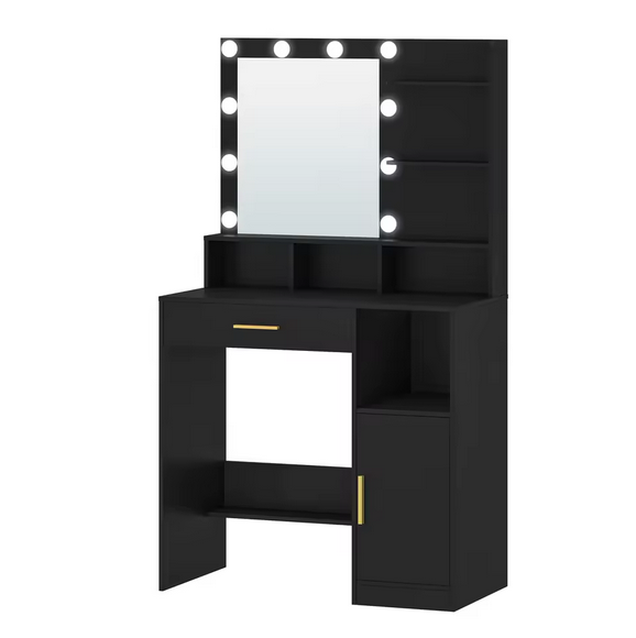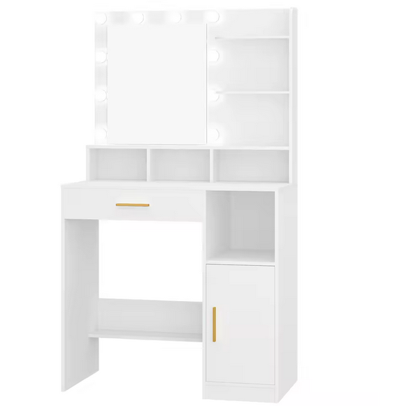Toaletka z Lustrem LED, 3 Półkami, 4 Otwartymi Przegrodami i Szafką – Nowoczesny Stolik Makijażowy Premium